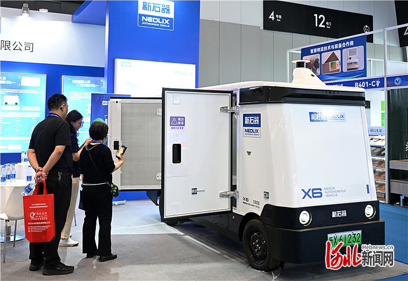 6月18日,在智慧物流技术与装备展区,新石器慧通(北京)科技有限公司工作人员在介绍该公司研发的无人车。 河北日报记者 赵永辉摄